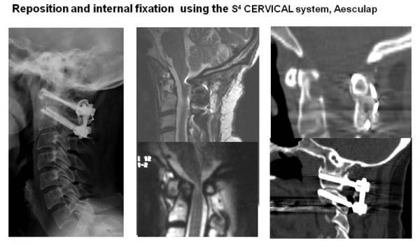 Bei verschiedenen Zuständen (Unfall oder Rheuma aber auch bei Tumoren) kann es zu einer Instabilität zwischen dem 1. und 2. Halswirbel (C1-C2) kommen, vor allem wenn das Band, welches die beiden Wirbel miteinander verbindet, sich lockert oder zerreißt. Dabei verlagert sich der so genannte Dens (Zahn des 2. Halswirbels) nach hinten. Dies kann zu einer deutlichen Einengung des Wirbelkanals führen mit Druckwirkung auf das Rückenmark, was wiederum neurologische Ausfälle wie Lähmungen oder Sensibilitätsstörungen verursachen kann. Ziel einer Operation ist die Entlastung der nervalen Strukturen und die Beseitigung der Instabilität. Dazu wird zunächst die korrekte Position zwischen C1 und C2 wiederhergestellt und dann werden die beiden Wirbel in dieser Position verbunden, d.h. fixiert. Dies kann einerseits über eine direkte Verschraubung der Gelenke die so genannte transartikuläre Fixation erfolgen oder über eine Fixation mittels Schrauben in die  Massae laterles und Pedikel, die mit einer Stange verbunden werden.